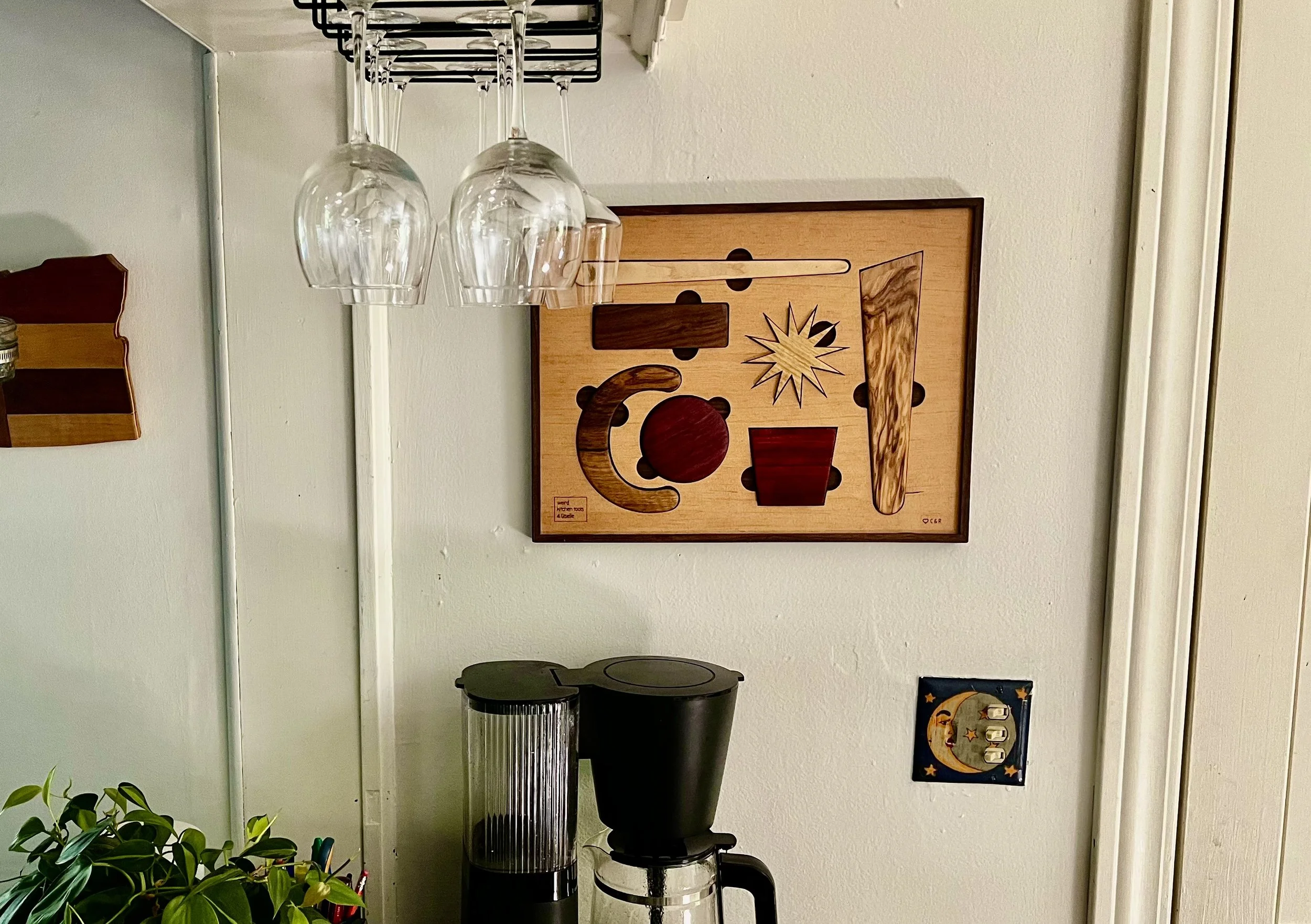 This 12 point star lights up the display with one of the most eye-catching shapes. Made out of canary wood, the sky is the limit for what this could do in a kitchen! This one took a really really long time to sand.